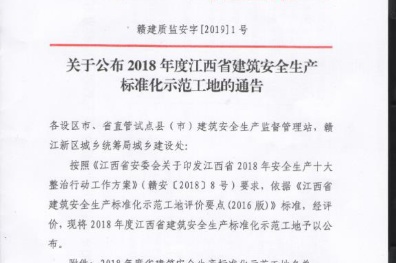 2019年4月3日,瑞昌市安全生產(chǎn)委員會(huì)為肯定先進(jìn)、樹立典型,進(jìn)一步推動(dòng)市安全生產(chǎn)工作再上新臺(tái)階,決定對(duì)2018年全市安全生產(chǎn)目標(biāo)管理考評(píng)先進(jìn)單位和先進(jìn)個(gè)人予以通報(bào)表揚(yáng)。我單位榮獲2018年度建筑業(yè)安全生產(chǎn)唯一的“先進(jìn)企業(yè)”稱號(hào)。我單位會(huì)繼續(xù)扎實(shí)開展安全生產(chǎn)專項(xiàng)整治,強(qiáng)化安全生產(chǎn)風(fēng)險(xiǎn)管控,為我經(jīng)濟(jì)社會(huì)平穩(wěn)較快發(fā)展創(chuàng)造良好的安全生產(chǎn)環(huán)境。