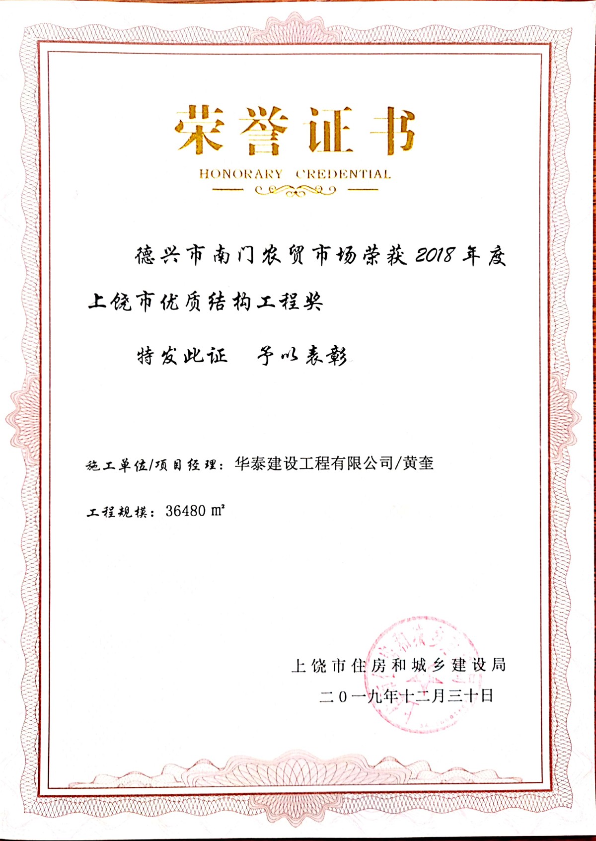 日前,由華泰建設(shè)工程有限公司承建的上饒德興南門農(nóng)貿(mào)市場項(xiàng)目,榮獲了上饒市住房和城鄉(xiāng)建設(shè)局頒發(fā)的“2018年度上饒市優(yōu)質(zhì)結(jié)構(gòu)工程獎(jiǎng)”。