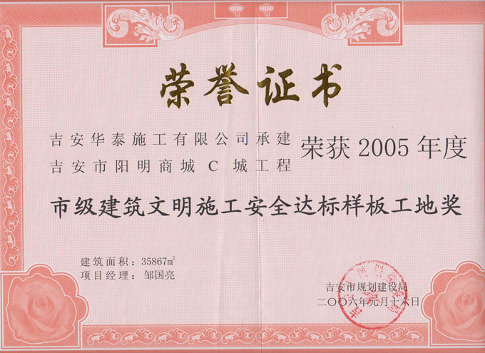 首頁 > 關(guān)于華泰 > 企業(yè)榮譽(yù) > 吉安陽明商城C城工程榮獲市級(jí)建筑文明樣板工地獎(jiǎng)