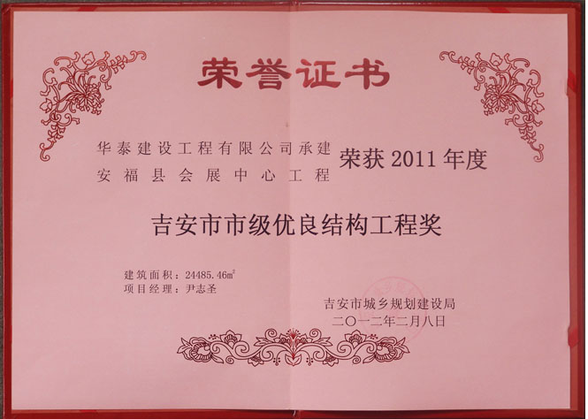 安福會展中心獲得2011市級優(yōu)良結(jié)構(gòu)工程獎