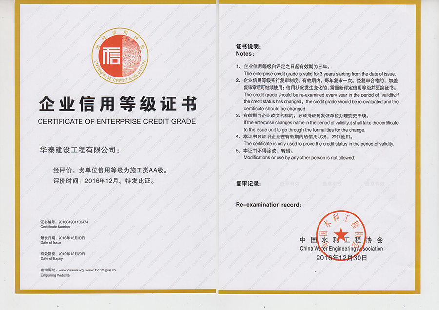 獲得中國水利工程協(xié)會企業(yè)信用等級證書——2016年施工類AA級