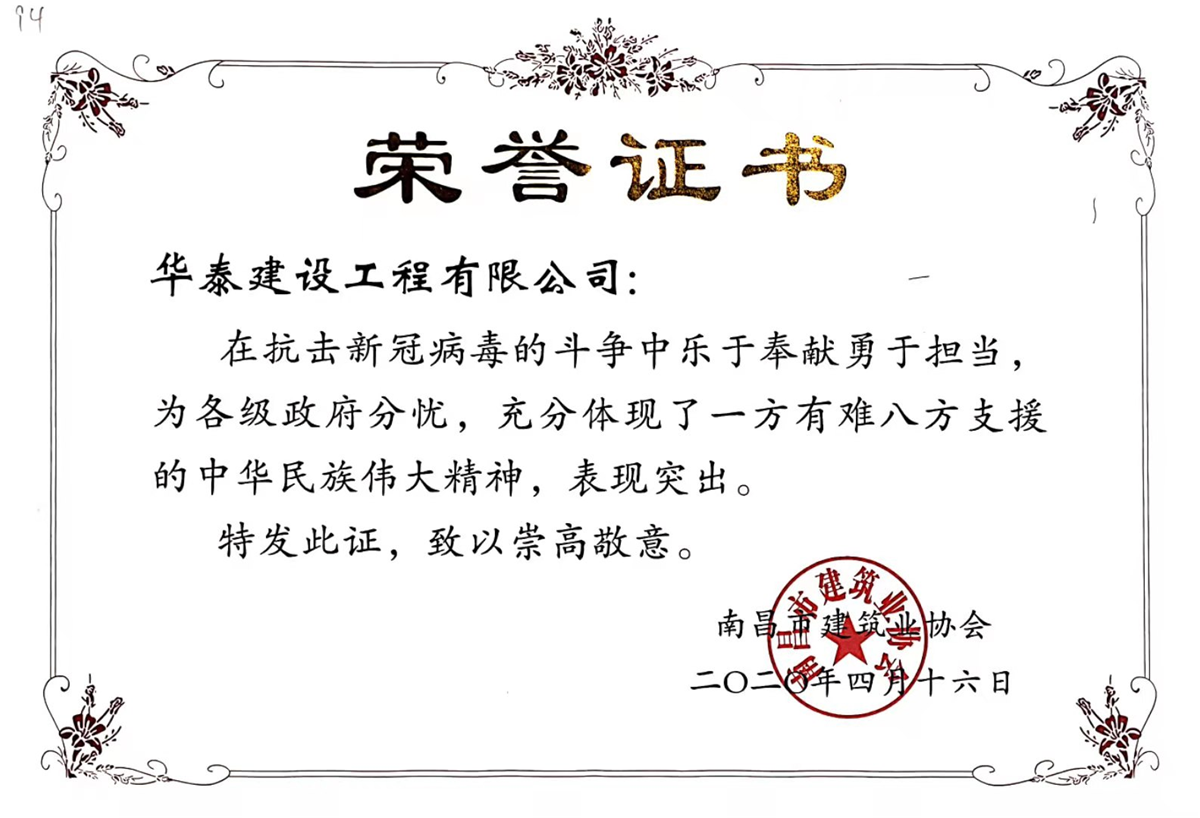 榮獲2020年抗擊疫情榮譽證書