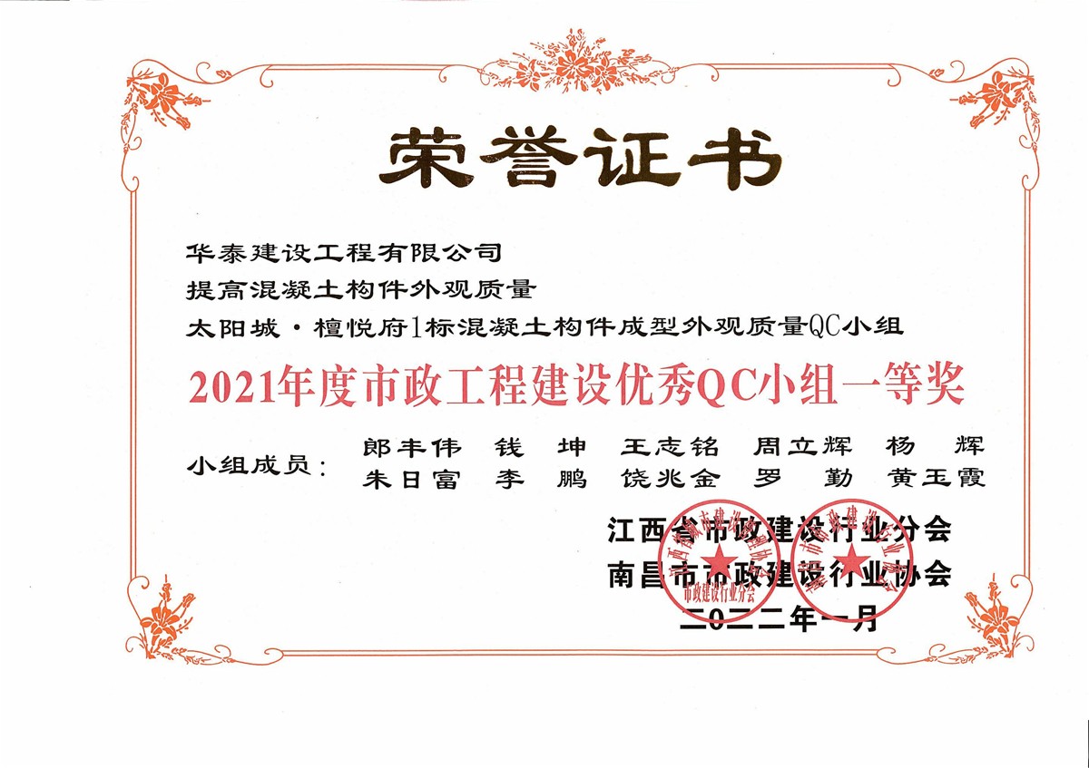 榮獲2021年度江西省市政工程建設(shè)優(yōu)秀QC小組一等獎(太陽城·檀悅府)